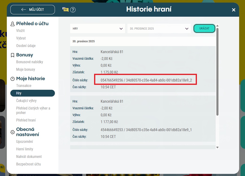 Pro číslo hry navštivte Můj účet, sekci Moje historie a zvolte Hry. V horním menu zvolte položku Hry. Číslo hry odpovídá položce Číslo sázky.