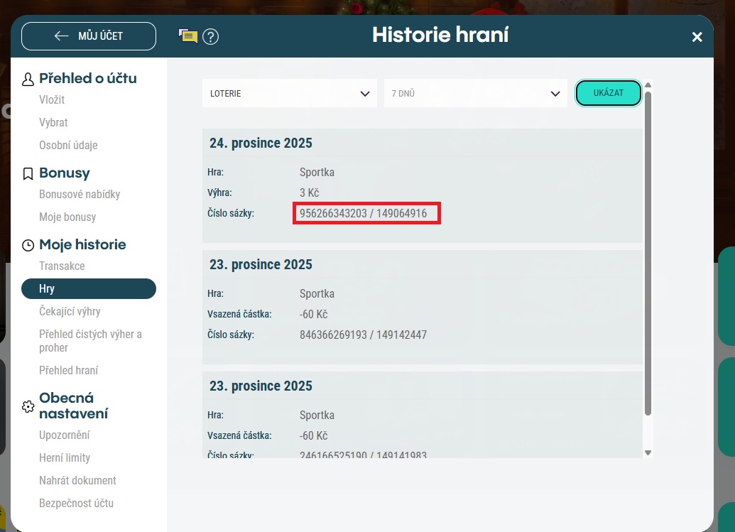 Pokud jste si vsadili online, pak pro číslo sázky navštivte Můj účet a v sekci Moje historie zvolte Hry. V menu nahoře si vyberte loterie.