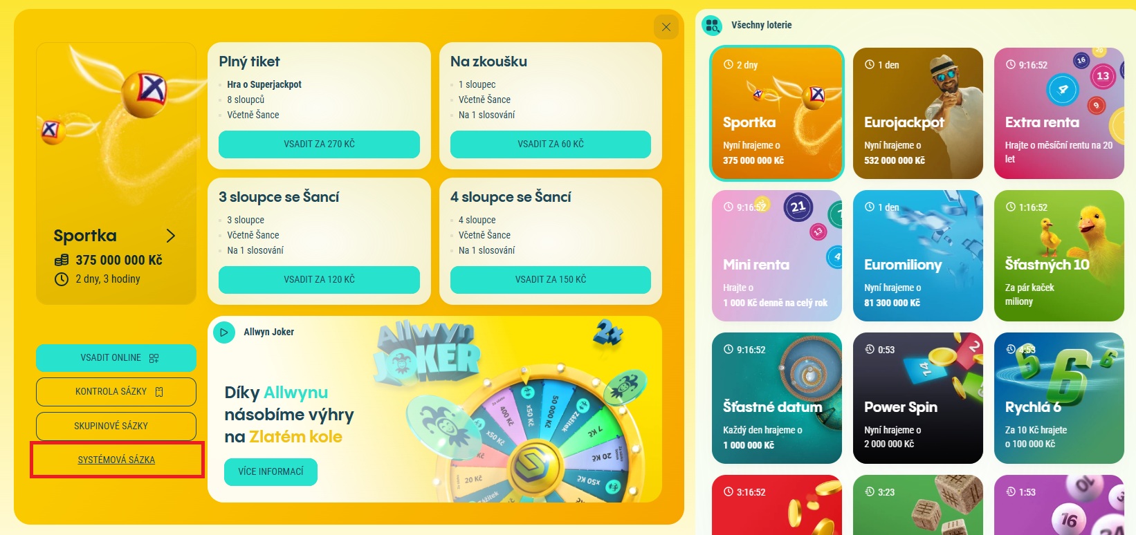 Na stránce loterií si zvolte svou oblíbenou. Systémová sázka je dostupná pro Sportku, Eurojackpot a Euromiliony. V pop-overu dané loterie klikněte na Systémová sázka a následně pokračujte volbou počtu čísel, výběrem čísel a dne slosování. I pro systémovou sázku si můžete nastavit předplatné nebo trvalý příkaz. Jakmile budete se vším spokojeni, klikněte na VSADIT. A je to!