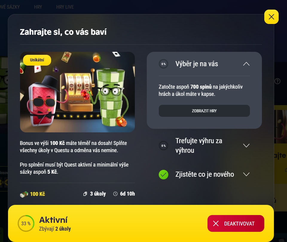 Questy se mohou objevovat nepravidelně na stránce Bonusomatu. Po rozkliknutí detailu Questu uvidíte, jaké úkoly je třeba splnit pro získání odměny a také, jaká je odměna za jeho splnění.