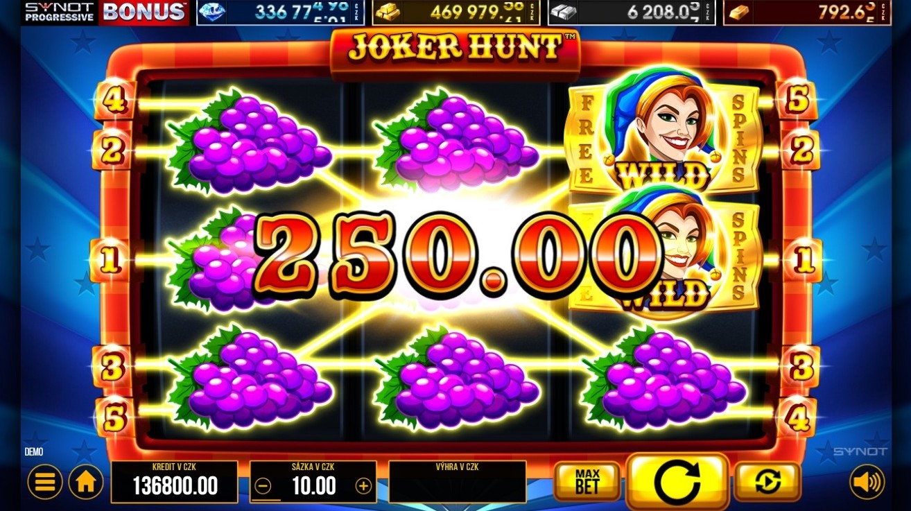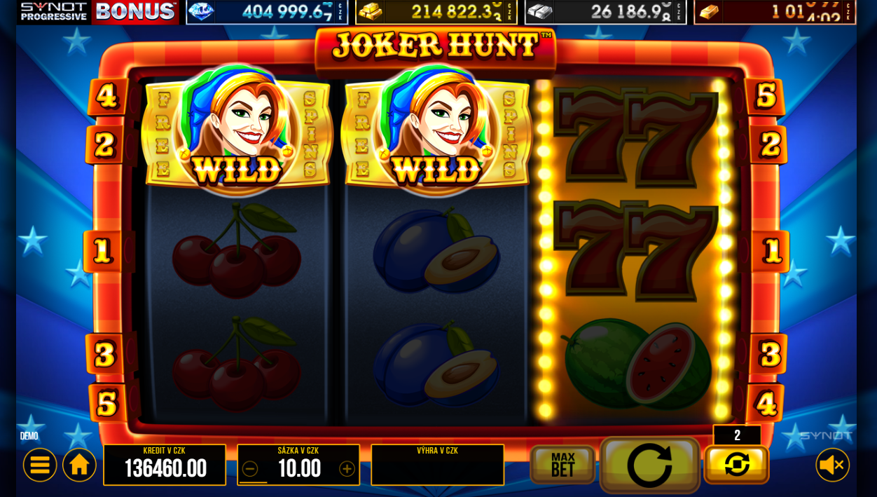 Online automat Joker Hunt od dodavatele Synot Games je klasickou ovocnou casino hrou se 3 válci a 5 výherními liniemi.