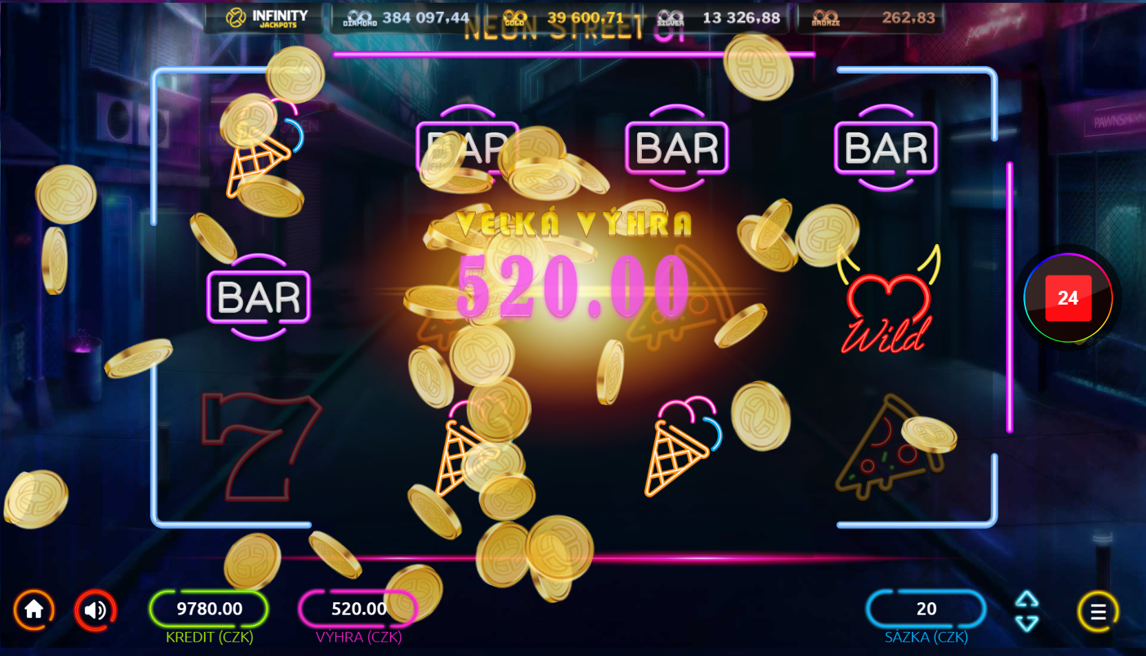 Rozsviťte neonové výlohy v online automatu Neon Street 81 od dodavatele Spinfinity a vydejte se do ulic pulzujícího velkoměsta přímo v online casinu Sazka Hry od Allwynu.