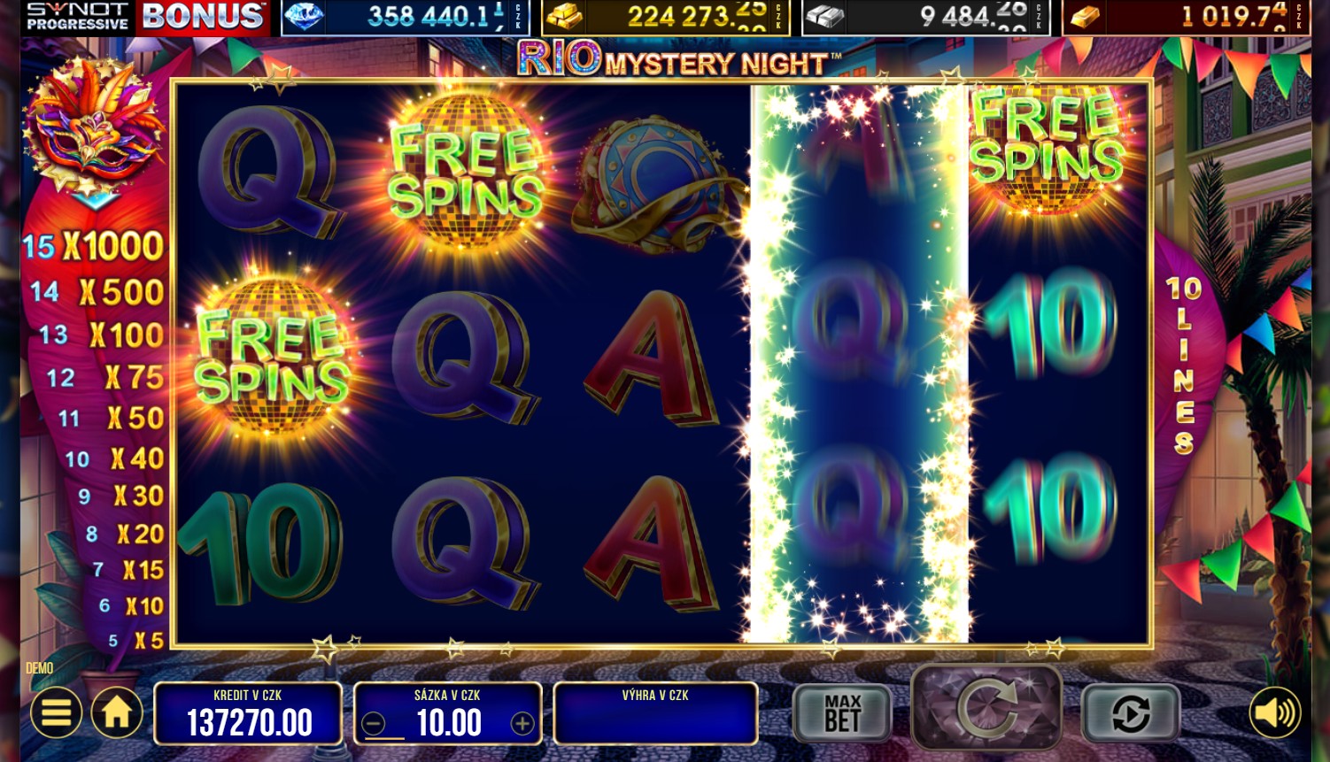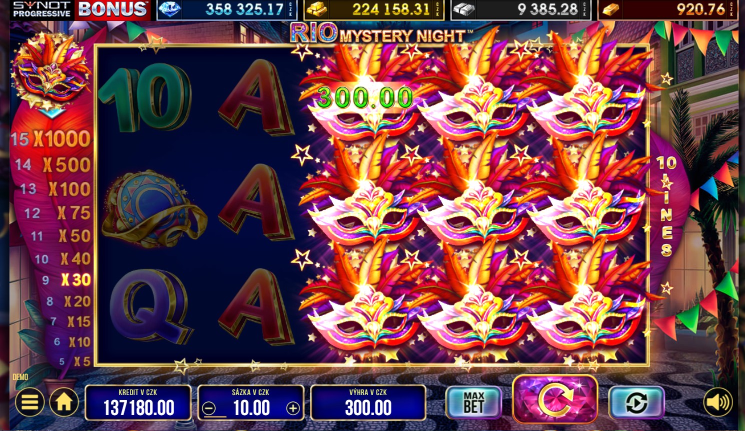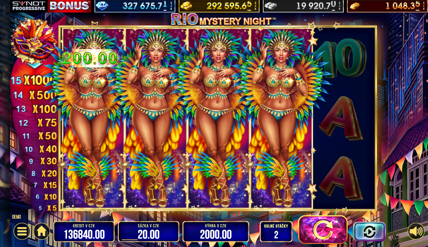 Rozžhavte válce online automatu Rio Mystery Night v online casinu Sazka Hry od Allwynu. Nasaďte si škrabošku a vydejte se za bonusem s free spiny zdarma.