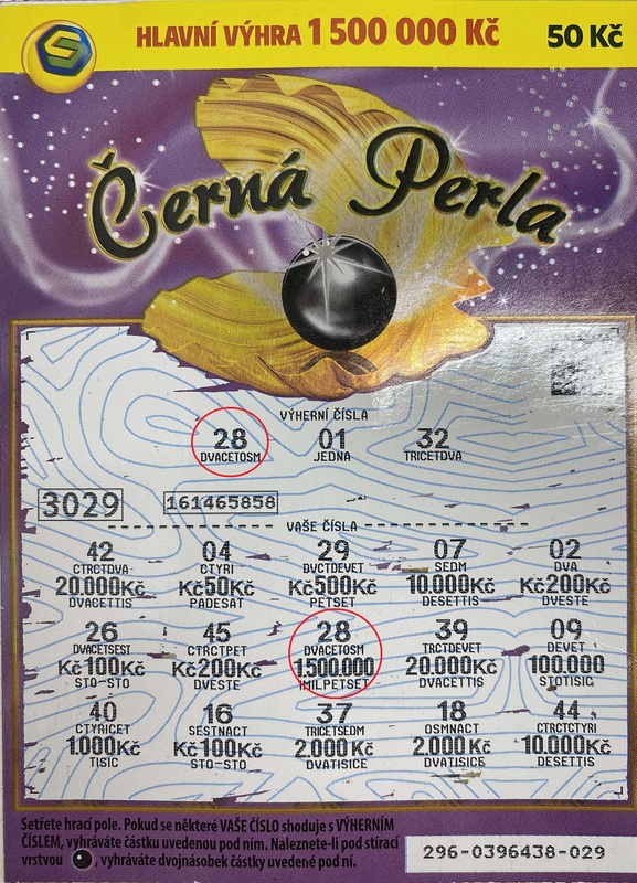 Díky shodě výherního čísla 28 v hracím poli se majitel tohoto losu Černá Perla může radovat z parádní hlavní výhry 1 500 000 Kč!
