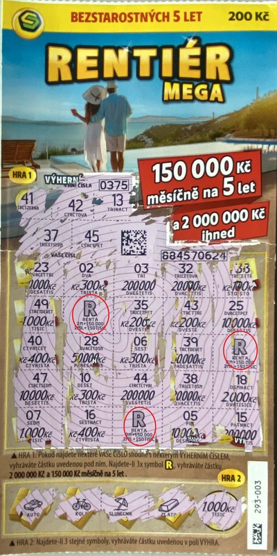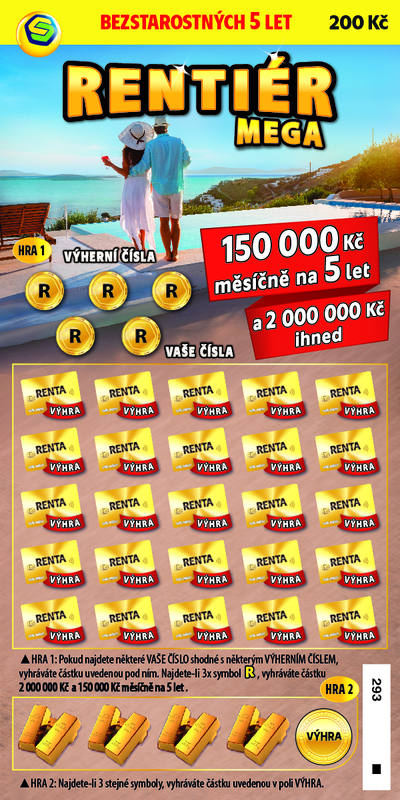Nález tří výherních symbolů „R“ přinesl majiteli tohoto losu Mega Rentier úžasnou kombinaci okamžité výhry 2 000 000 Kč a k tomu měsíční rentu 150 000 Kč na celých 5 let!