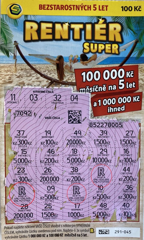 Tři symboly „R“ na jednom losu Super Rentier zajistily výherci luxusní rentu 100 000 Kč měsíčně na 5 let a k tomu okamžitou výhru 1 000 000 Kč na ruku!