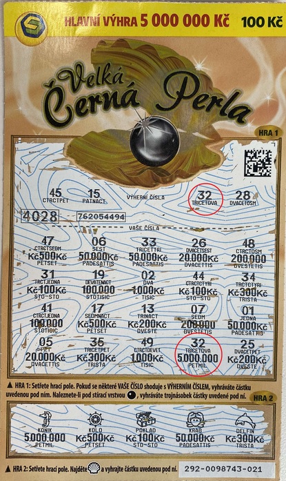 Shoda výherního čísla 32 s hracím polem přinesla majiteli tohoto losu Velká Černá Perla pohádkovou hlavní výhru 5 000 000 Kč!