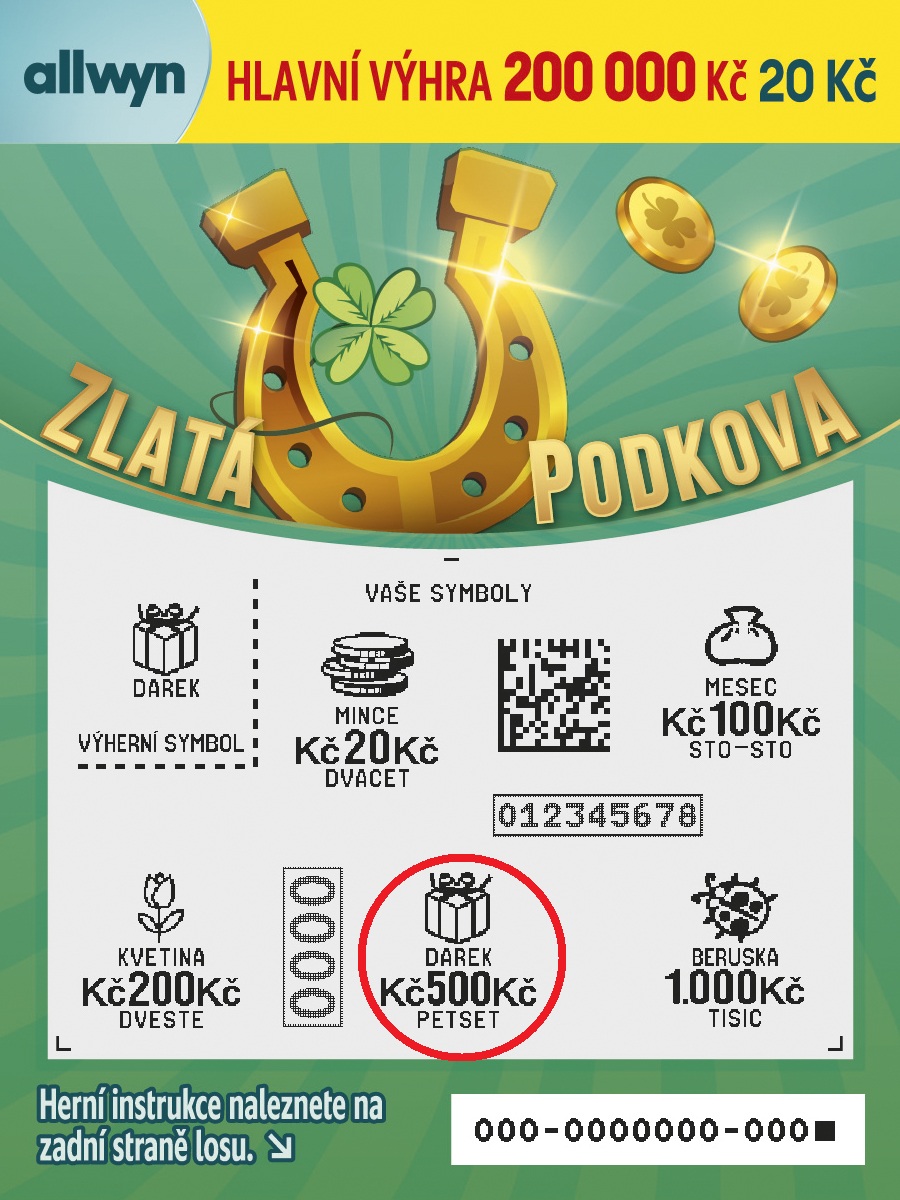 Zlatá podkova je symbolem štěstí, který má chránit a přitahovat výhry. Už za 20 Kč můžete zkusit štěstí a setřít si výhru až 200 000 Kč. Malý los, velká šance — někdy stačí mít štěstí na své straně.