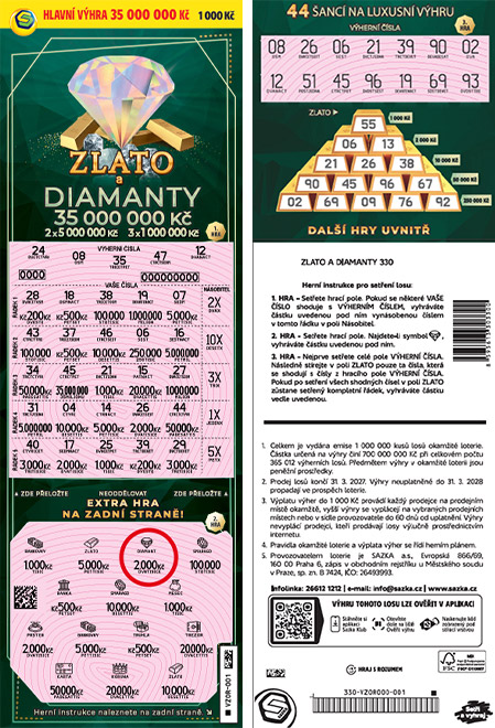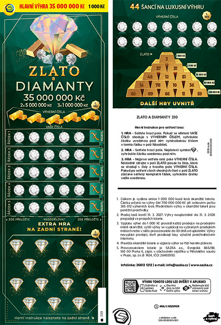 Novinka, která posouvá hranice našeho portfolia stíracích losů. Aby byl tento los co nejzajímavější, poprvé jsme využili tisk hry na zadní stranu. To zvýšilo počet šancí na výhru na 44. Los pro odvážné hráče s velkými sny, kteří chtějí hodně vyhrát, a jsou ochotni za cestě za velkou výhrou i riskovat. Výhra není jistá, ale když přijde, je luxusní. Pravděpodobnost na výhru 5 000Kč je na tomto losu 1:33! Jako hlavní výhru má los 35 000 000 Kč, ale i další milionové výhry. 2x 5 000 000 Kč nebo 3x 1 000 000 Kč.